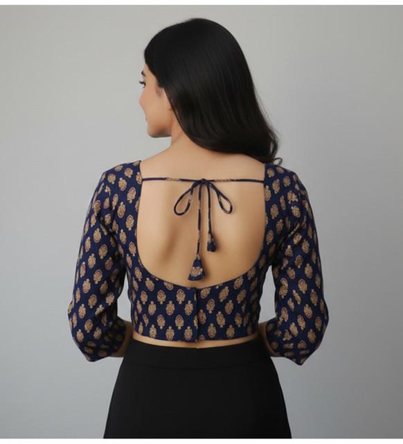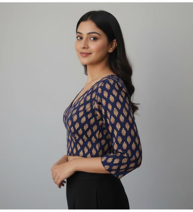 Generic Women's Ajrakh Cotton Printed Halter Neck Padded Blouse (Navy 38 Ready (Self Alterable 36–40)
