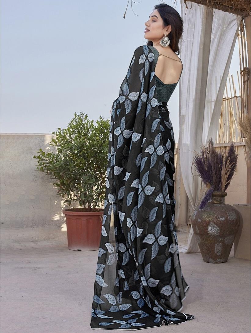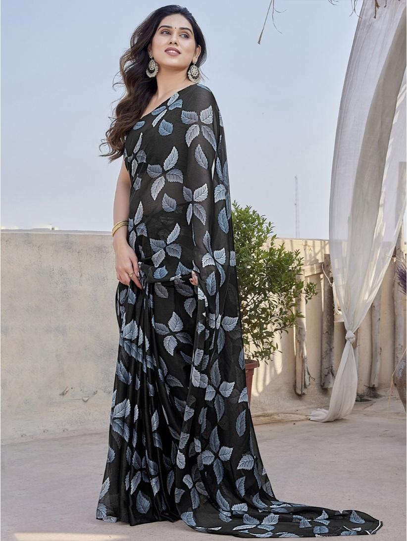 Generic Women's Chiffon Printed Saree With Unstitched Blouse 5.5Mtr (Black)