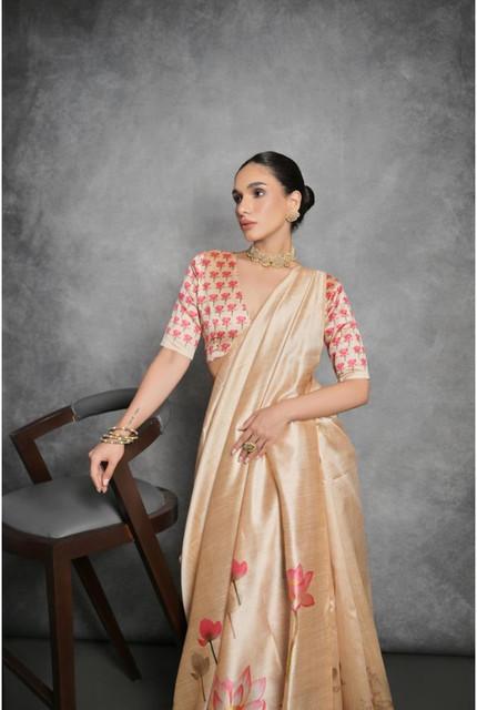 Generic Women's Cotton Printed Saree With Unstitched Blouse 5.5 Mtr (Beige)