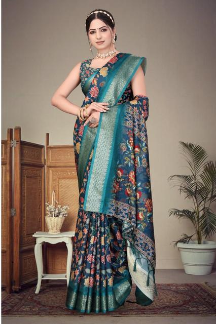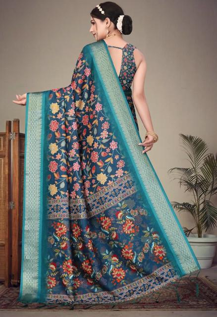 Generic Women's Cotton Silk Printed Saree With Unstitched Blouse 5.5Mtr (Blue)