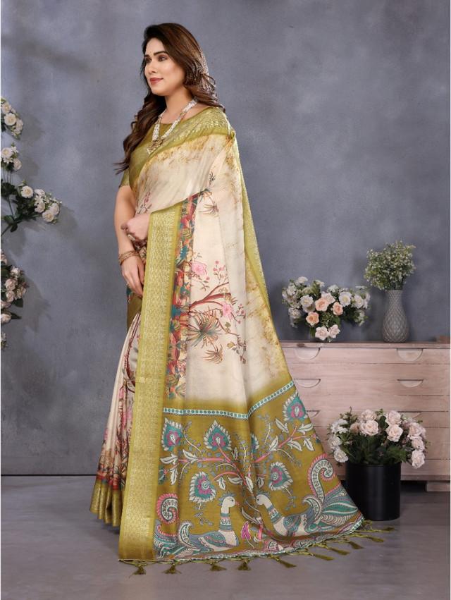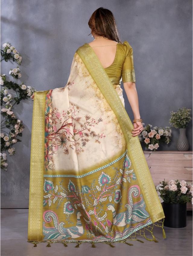 Generic Women's Cotton Silk Printed Saree With Unstitched Blouse 5.5Mtr (Olive Green)