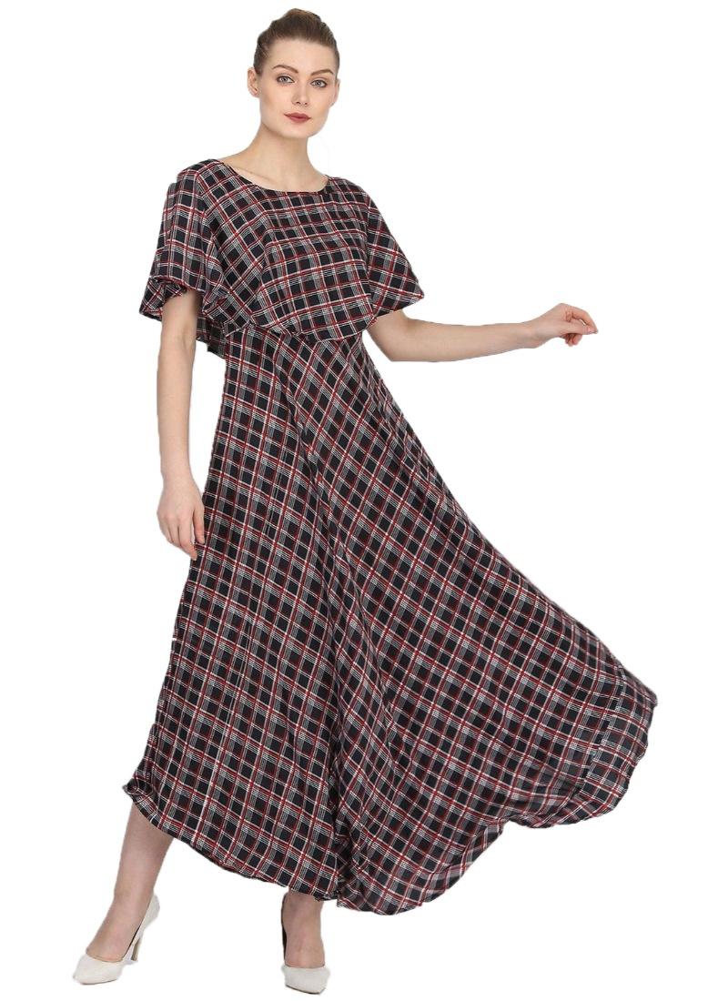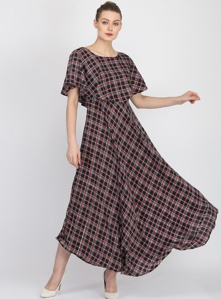 Generic Women's Crepe Checked Half Sleeves Full Length Gown(Multi)