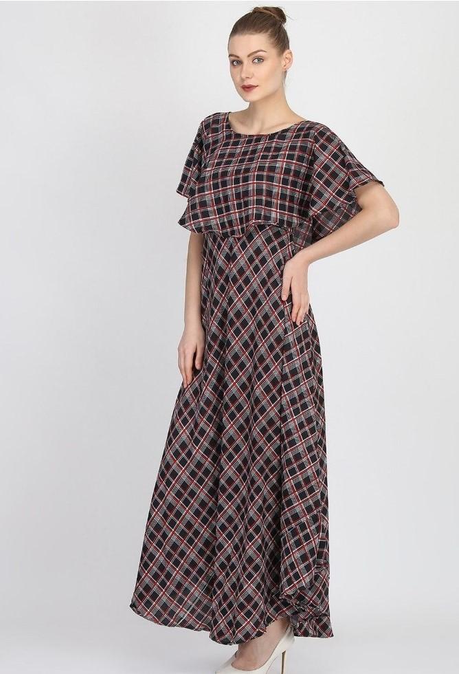 Women's Crepe Checked Half Sleeves Full Length Gown