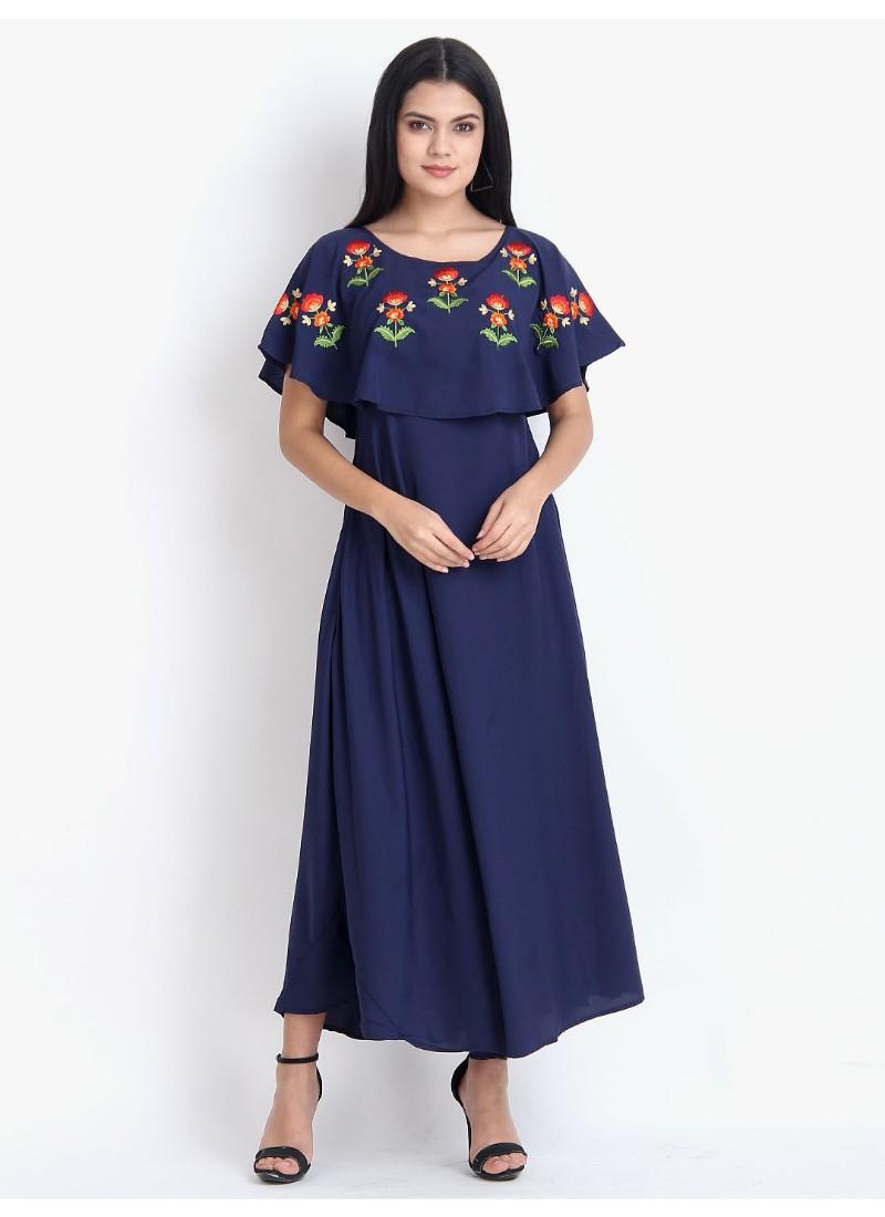 Generic Women's Crepe Embroidery Pattern Sleeveless Full Length Gown(Dark Blue)