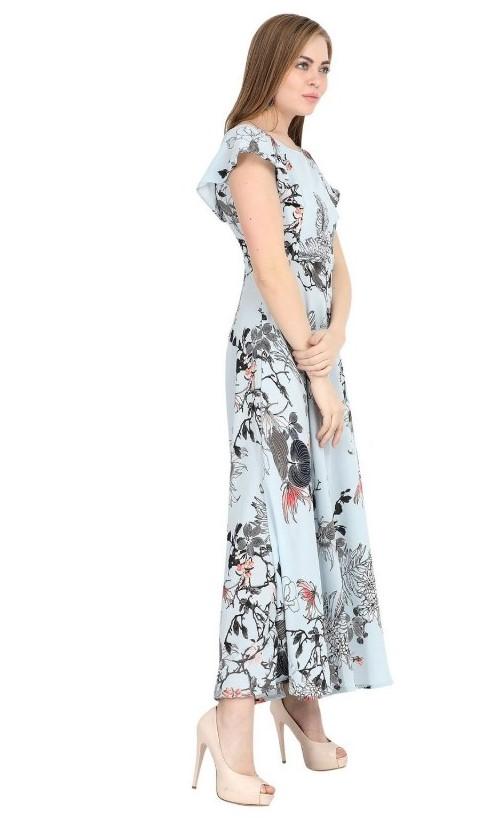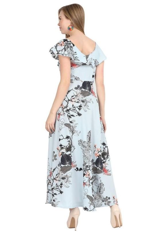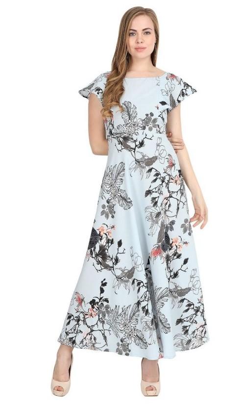 Generic Women's Crepe Floral Half Sleeves Full Length Gown(Blue)