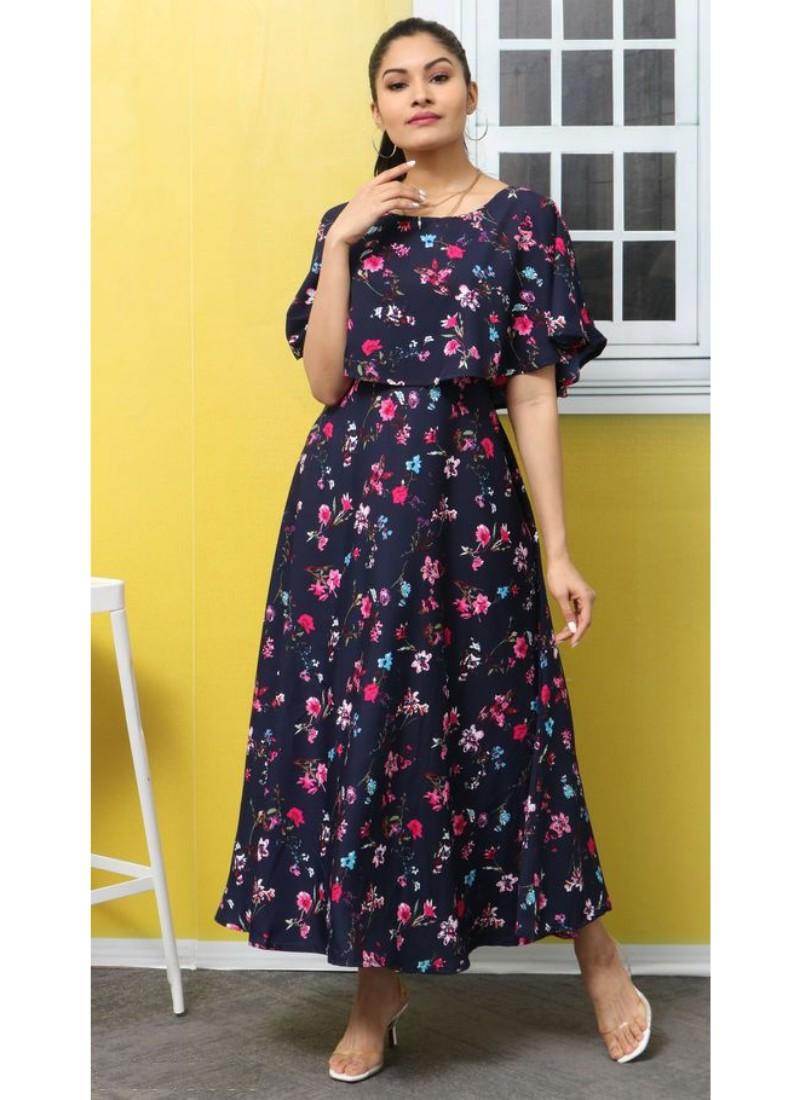 Generic Women's Crepe Floral Half Sleeves Full Length Gown(Dark Blue)