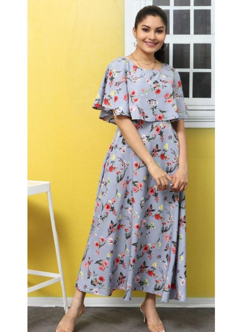 Generic Women's Crepe Floral Half Sleeves Full Length Gown(Light Grey)