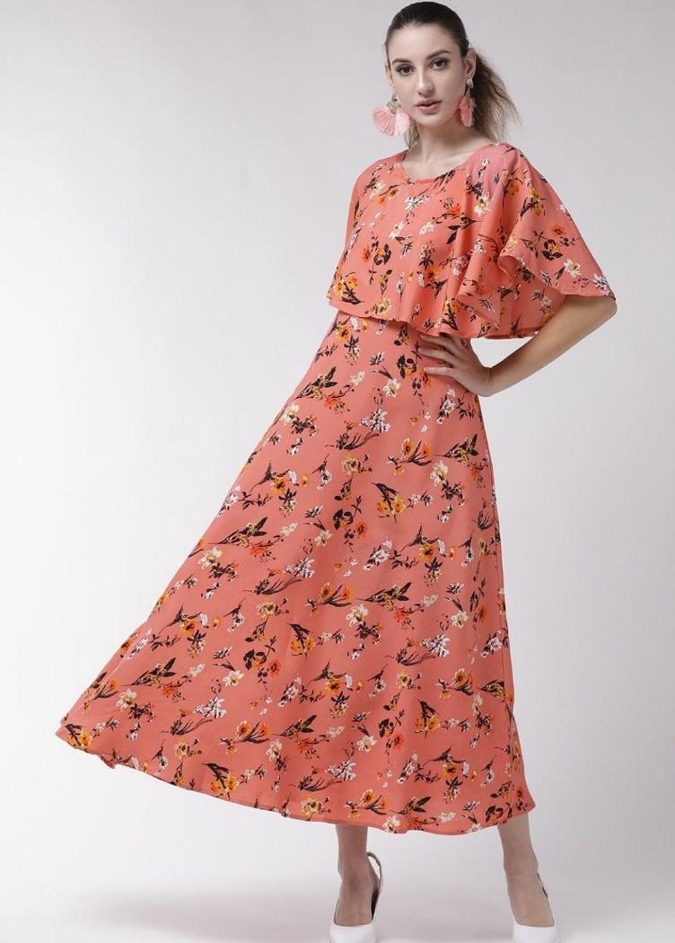 Generic Women's Crepe Floral Half Sleeves Full Length Gown(Orange)
