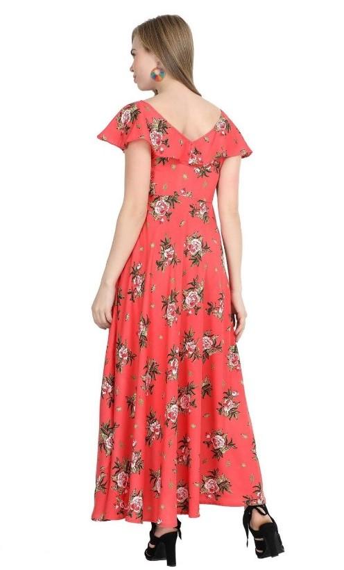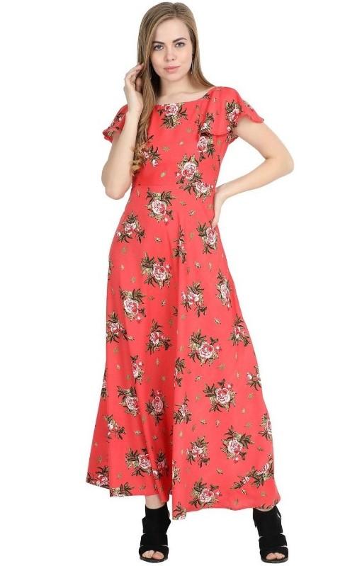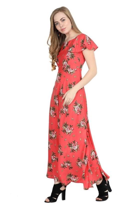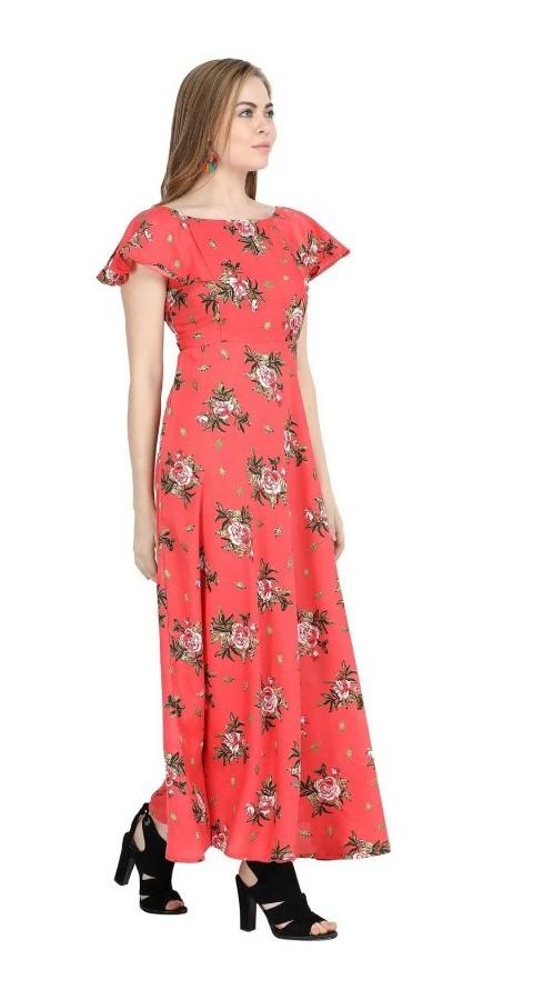 Generic Women's Crepe Floral Half Sleeves Full Length Gown(Red)