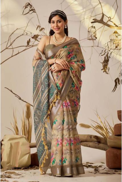 Women's Faux_Linen Printed Saree With Unstitched Blouse 5.5Mtr
