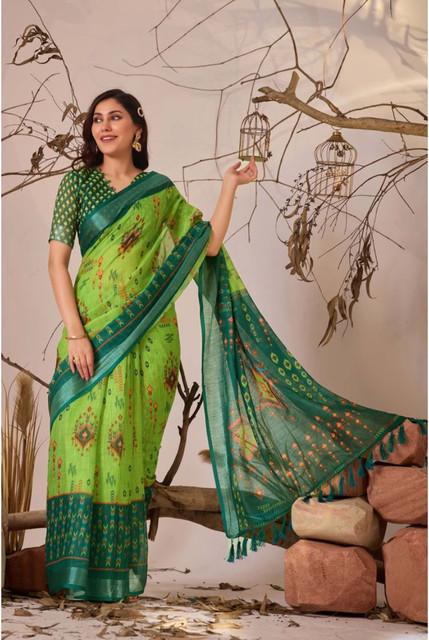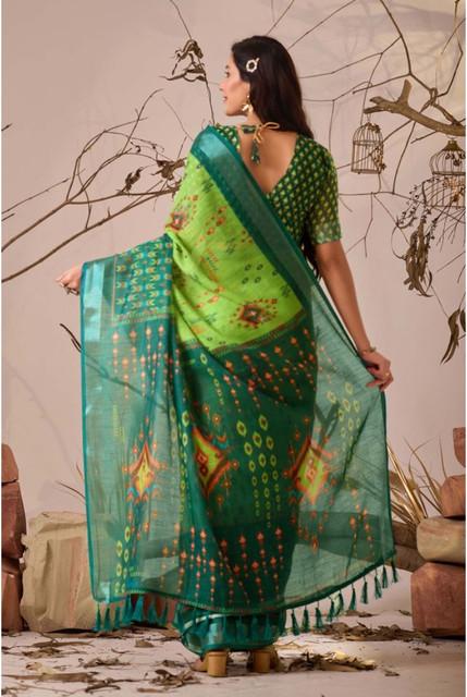 Generic Women's Faux_Linen Printed Saree With Unstitched Blouse 5.5Mtr (Green)