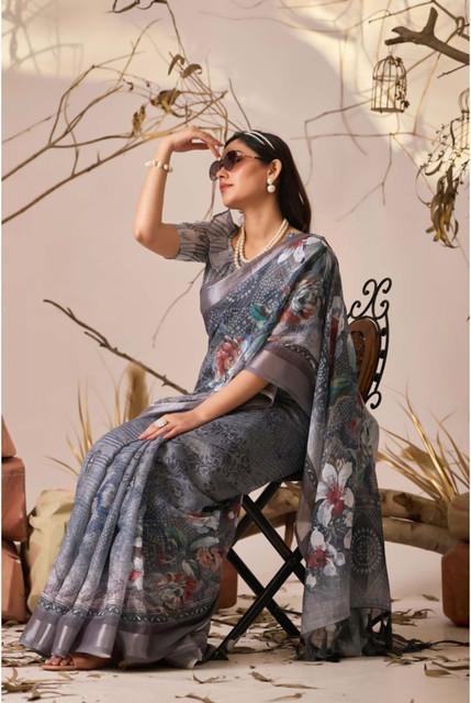Generic Women's Faux_Linen Printed Saree With Unstitched Blouse 5.5Mtr (Light_Grey)