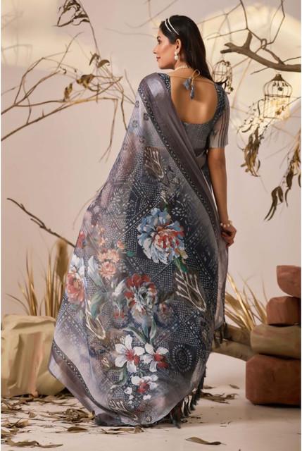 Women's Faux_Linen Printed Saree With Unstitched Blouse 5.5Mtr