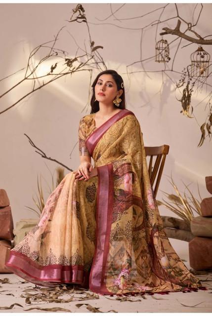 Women's Faux_Linen Printed Saree With Unstitched Blouse 5.5Mtr