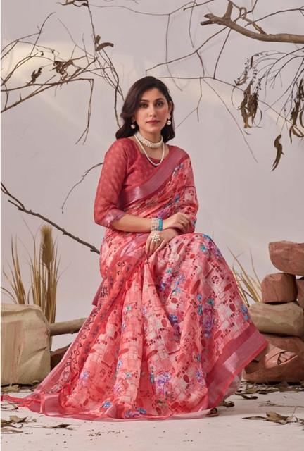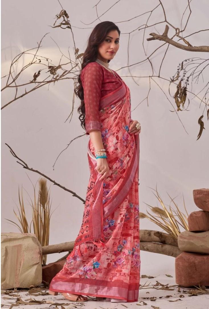 Women's Faux_Linen Printed Saree With Unstitched Blouse 5.5Mtr