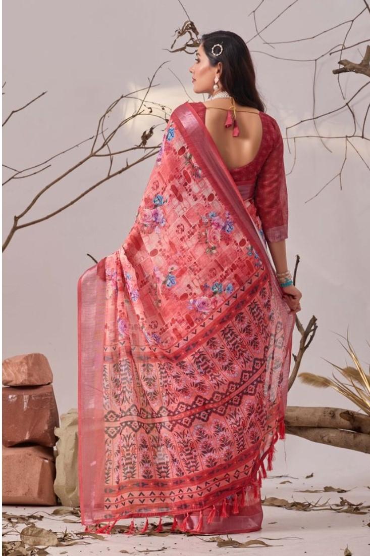 Generic Women's Faux_Linen Printed Saree With Unstitched Blouse 5.5Mtr (Rose)