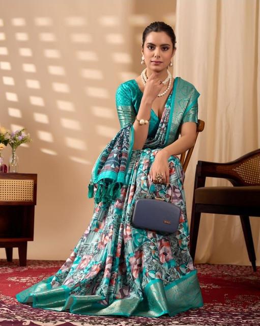 Generic Women's Faux_Silk Printed Saree With Unstitched Blouse 5.5Mtr (Turquoise)