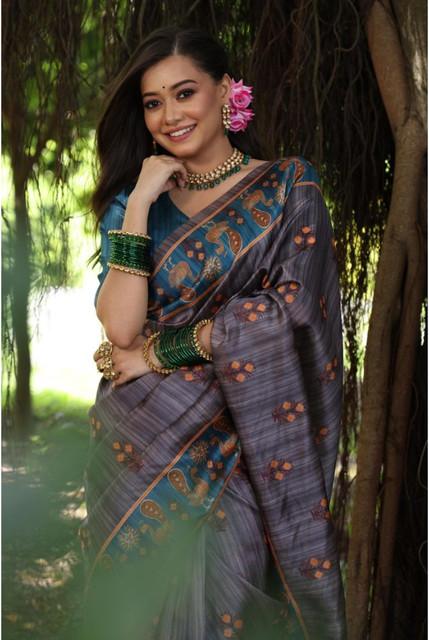 Generic Women's Faux_Tussar_Silk Printed Saree With Unstitched Blouse 5.5Mtr (Grey)