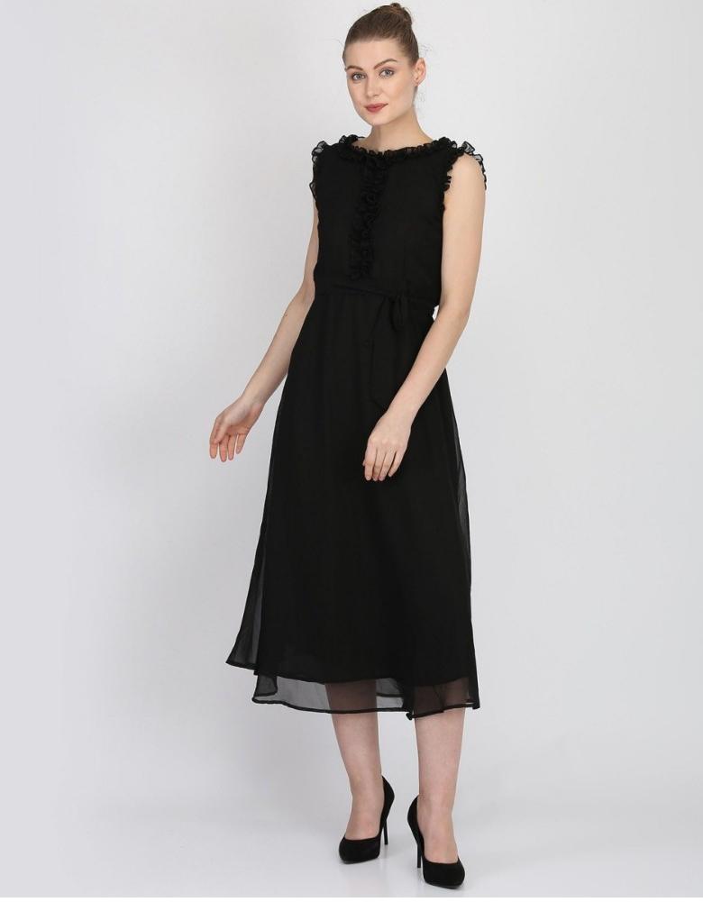 Generic Women's Georgette Solid Sleeveless Full Length Gown(Black)
