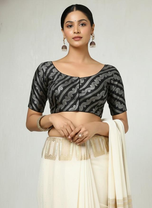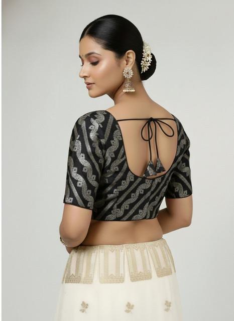 Generic Women's Jacquard Zari Round Neck Padded Blouse (Black 38 Ready (Self Alterable 36–40)