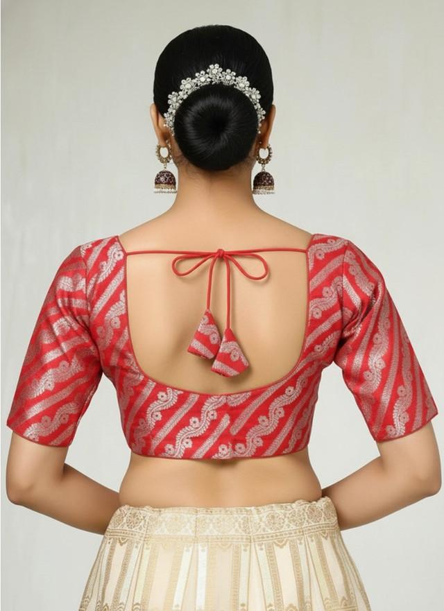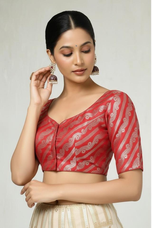 Generic Women's Jacquard Zari Round Neck Padded Blouse (Red 38 Ready (Self Alterable 36–40)