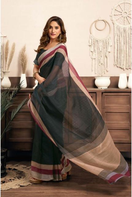 Women's Linen Cotton Plain Ready To Wear With Pocket Saree With Unstitched Blouse 5.5 Mtr