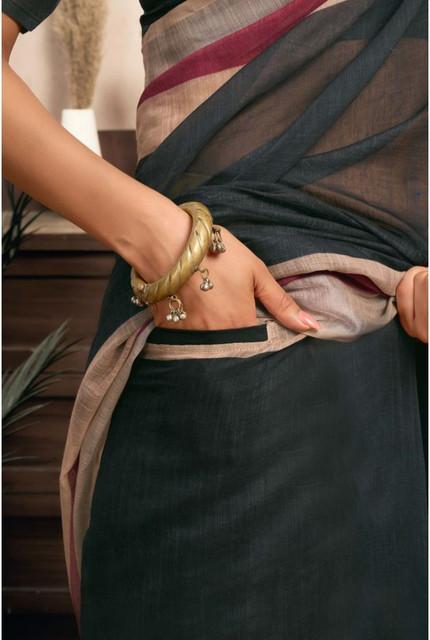 Generic Women's Linen Cotton Plain Ready To Wear With Pocket Saree With Unstitched Blouse 5.5 Mtr (Black)