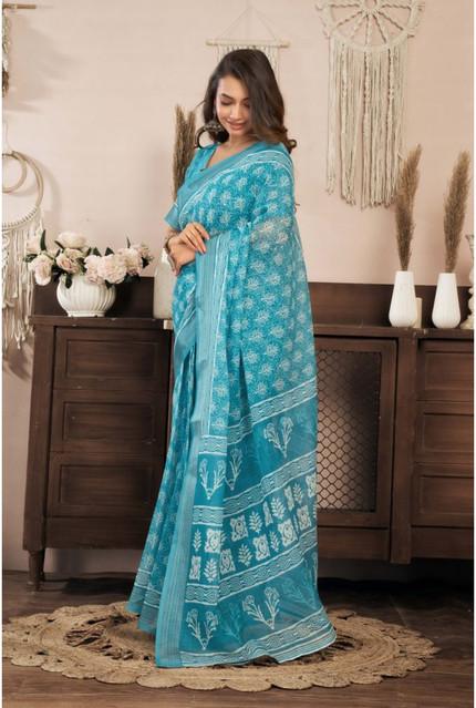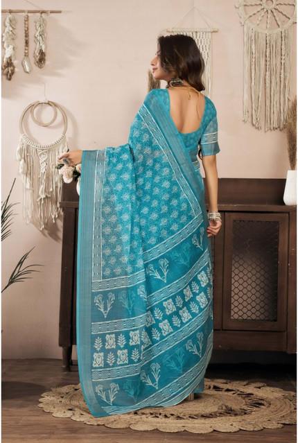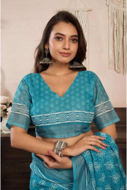 Generic Women's Linen Cotton Printed Ready To Wear Saree With Unstitched Blouse 5.5 Mtr (Aqua_Blue)