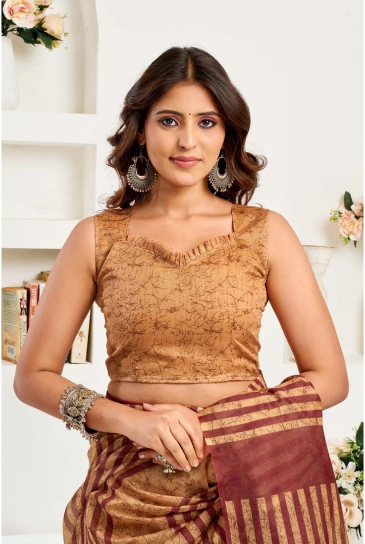 Generic Women's Linen Cotton Printed Ready To Wear Saree With Unstitched Blouse 5.5 Mtr (Brown)