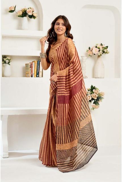 Women's Linen Cotton Printed Ready To Wear Saree With Unstitched Blouse 5.5 Mtr