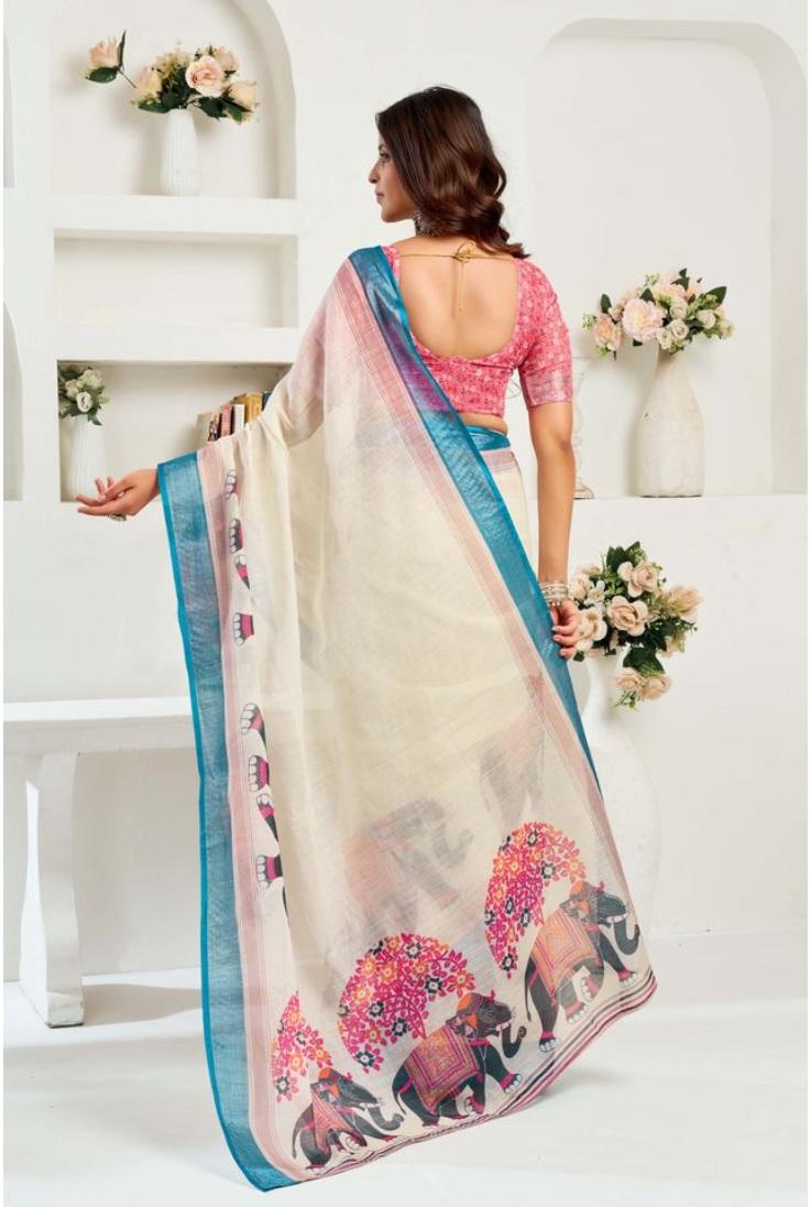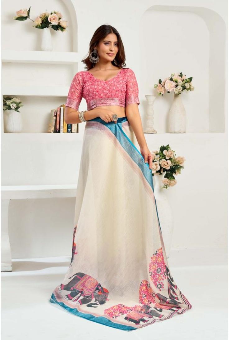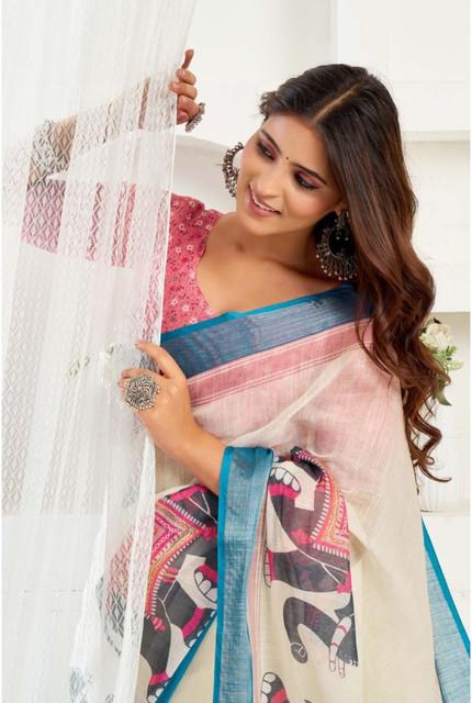 Women's Linen Cotton Printed Ready To Wear Saree With Unstitched Blouse 5.5 Mtr