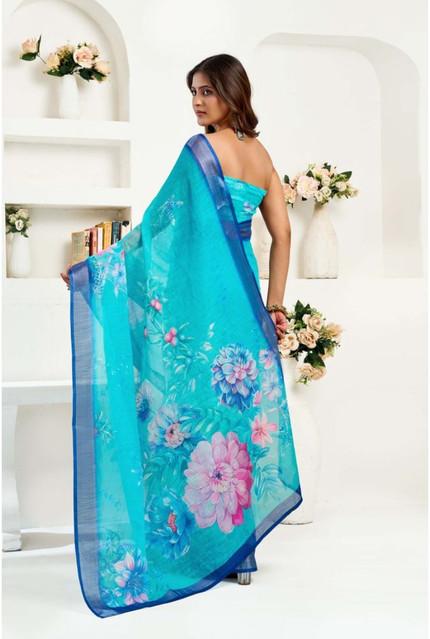 Generic Women's Linen Cotton Printed Ready To Wear Saree With Unstitched Blouse 5.5 Mtr (Light_Aqua_Blue)