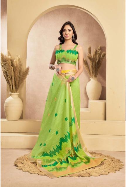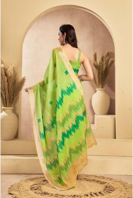 Generic Women's Linen Cotton Printed Ready To Wear Saree With Unstitched Blouse 5.5 Mtr (Lime)