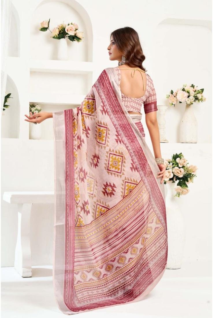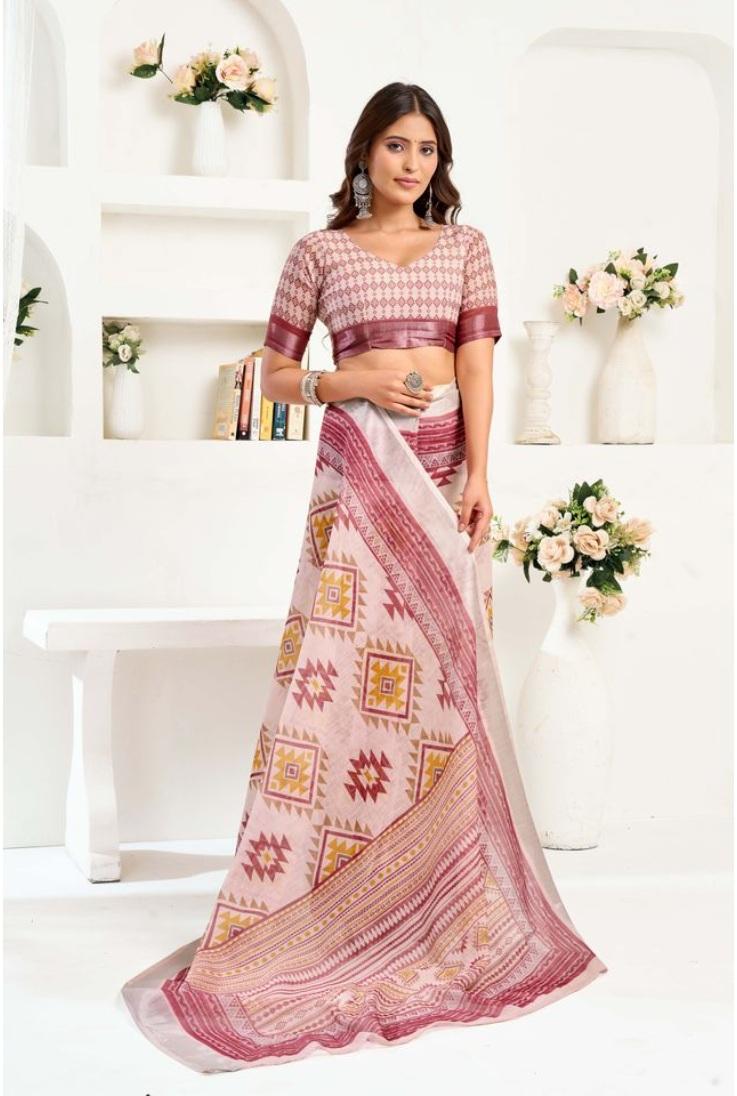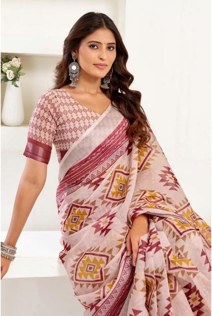Women's Linen Cotton Printed Ready To Wear Saree With Unstitched Blouse 5.5 Mtr