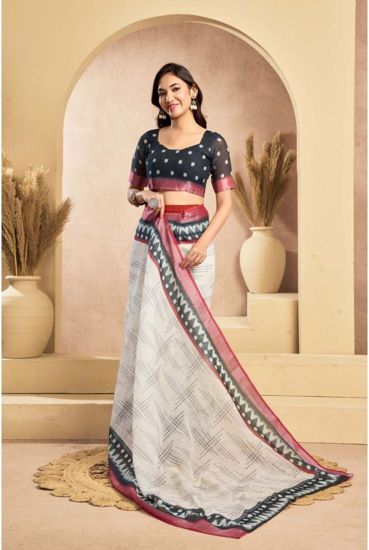 Generic Women's Linen Cotton Printed Ready To Wear Saree With Unstitched Blouse 5.5 Mtr (Off_White)