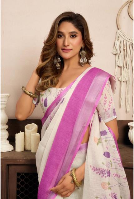 Generic Women's Linen Cotton Printed Ready To Wear Saree With Unstitched Blouse 5.5 Mtr (Off_White)