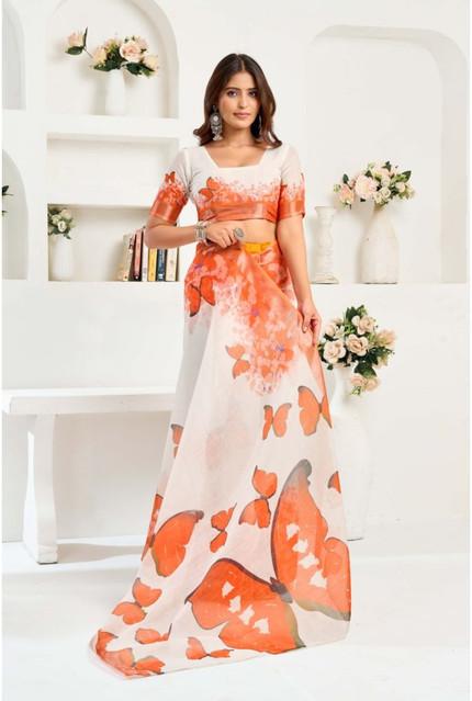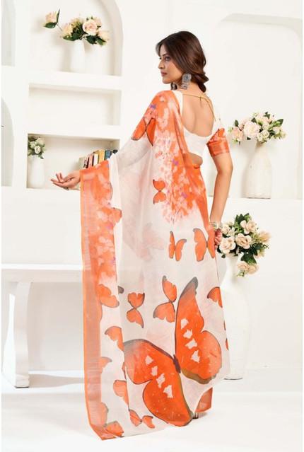 Generic Women's Linen Cotton Printed Ready To Wear Saree With Unstitched Blouse 5.5 Mtr (Orange)