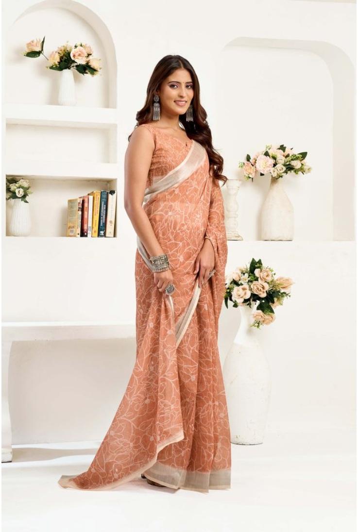 Women's Linen Cotton Printed Ready To Wear Saree With Unstitched Blouse 5.5 Mtr