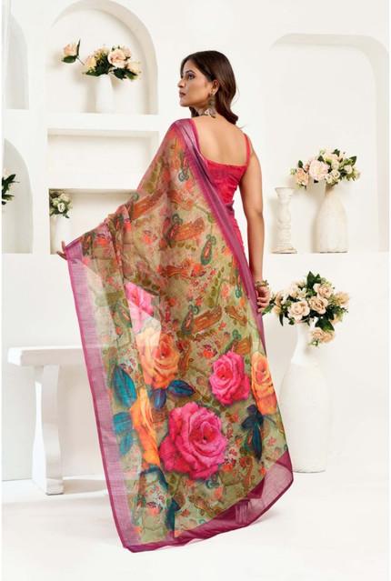 Women's Linen Cotton Printed Ready To Wear Saree With Unstitched Blouse 5.5 Mtr