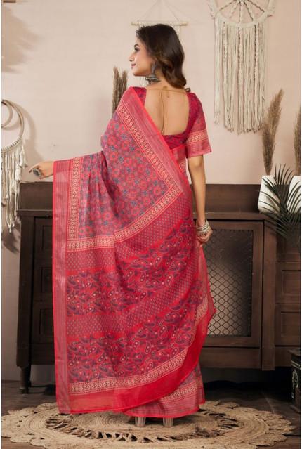 Generic Women's Linen Cotton Printed Ready To Wear Saree With Unstitched Blouse 5.5 Mtr (Red)