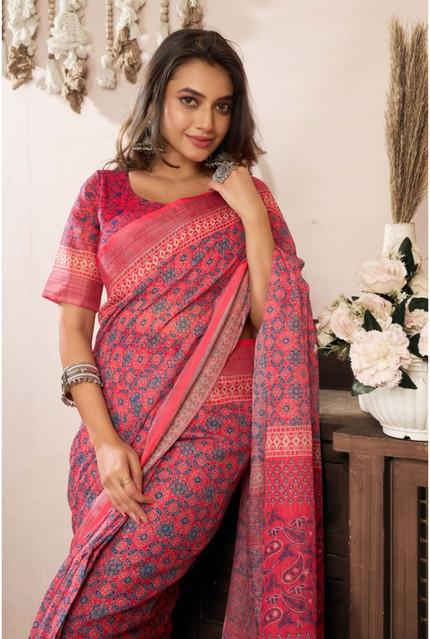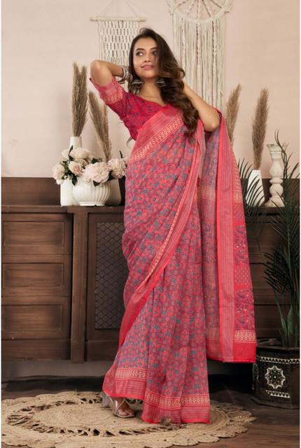 Women's Linen Cotton Printed Ready To Wear Saree With Unstitched Blouse 5.5 Mtr