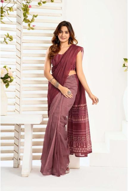 Women's Linen Cotton Printed Ready To Wear With Pocket Saree With Unstitched Blouse 5.5 Mtr