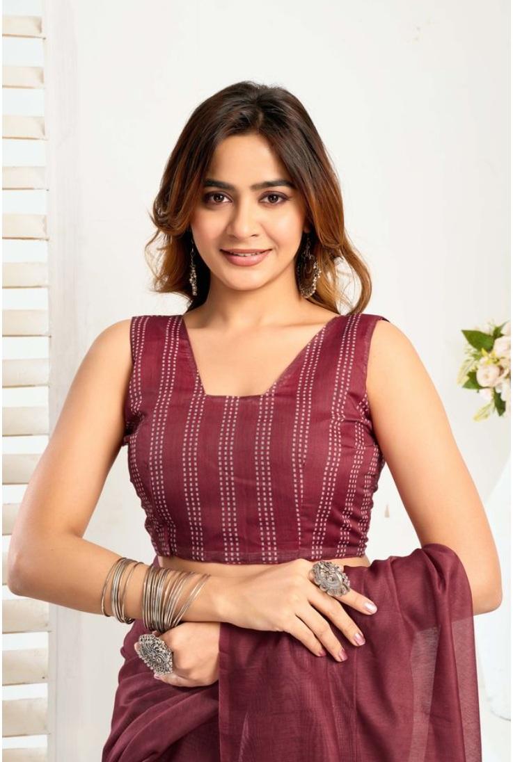 Generic Women's Linen Cotton Printed Ready To Wear With Pocket Saree With Unstitched Blouse 5.5 Mtr (Maroon)