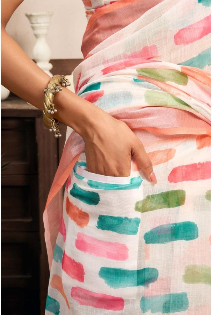 Generic Women's Linen Cotton Printed Ready To Wear With Pocket Saree With Unstitched Blouse 5.5 Mtr (Multicolor)