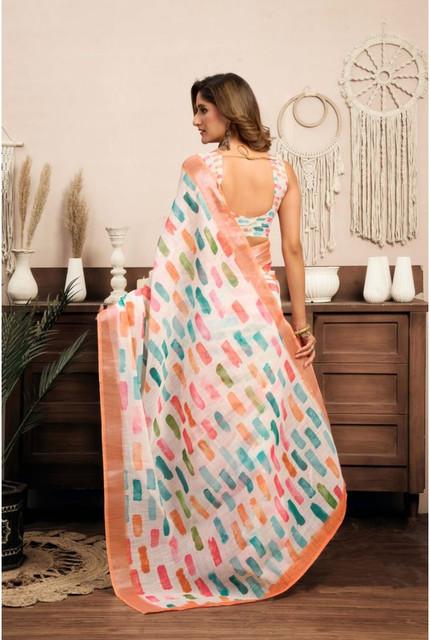 Women's Linen Cotton Printed Ready To Wear With Pocket Saree With Unstitched Blouse 5.5 Mtr