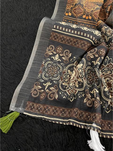 Women's Linen Cotton Printed Saree With Unstitched Blouse 5.5Mtr