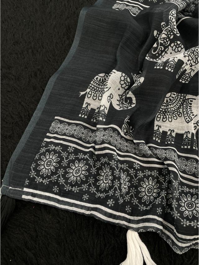 Generic Women's Linen Cotton Printed Saree With Unstitched Blouse 5.5Mtr (Black)