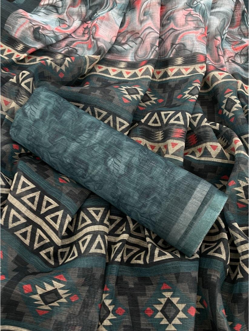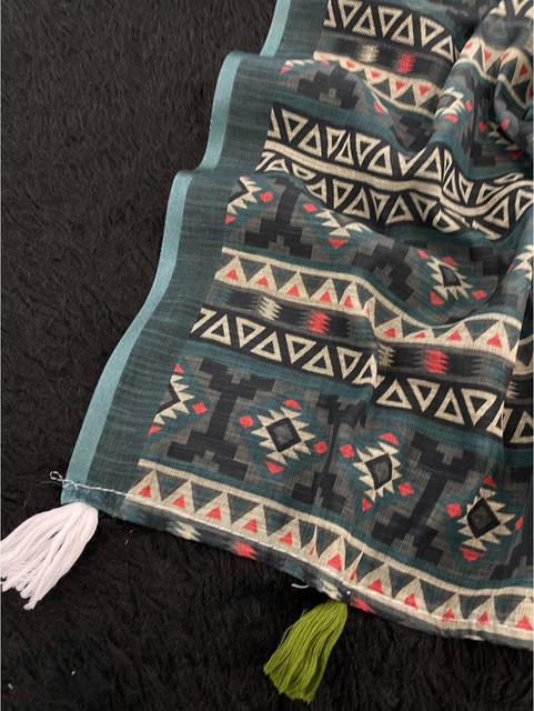 Women's Linen Cotton Printed Saree With Unstitched Blouse 5.5Mtr
