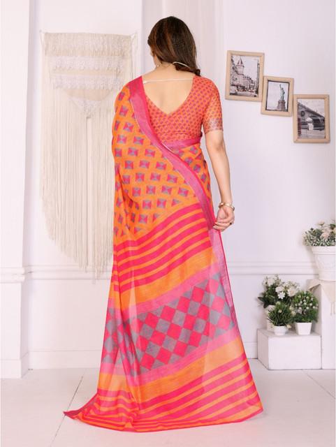 Generic Women's Linen Cotton Printed Saree With Unstitched Blouse 5.5Mtr (Orange )