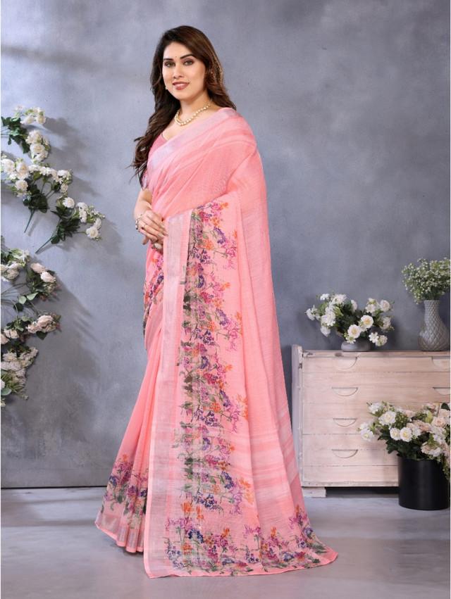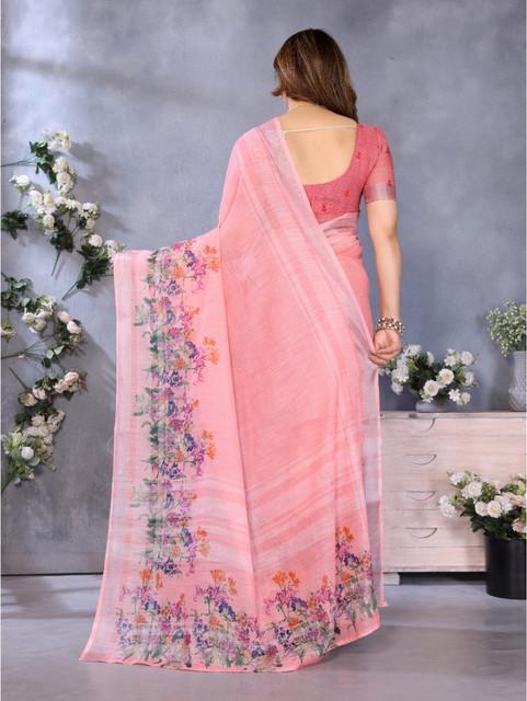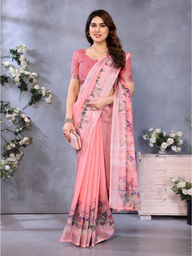 Women's Linen Cotton Printed Saree With Unstitched Blouse 5.5Mtr
